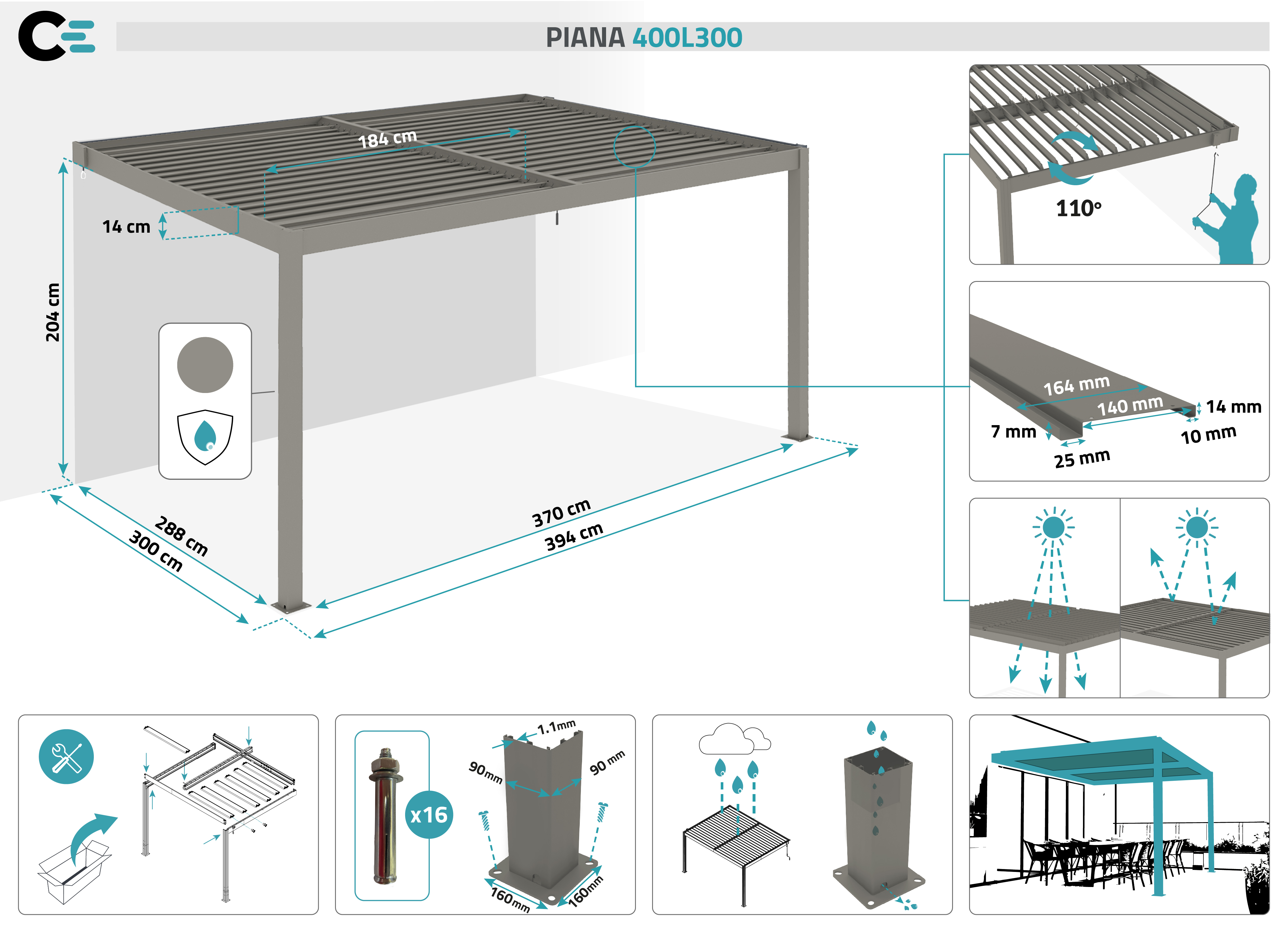 - 2 powder-coated aluminum posts (90x90x1.1 mm)